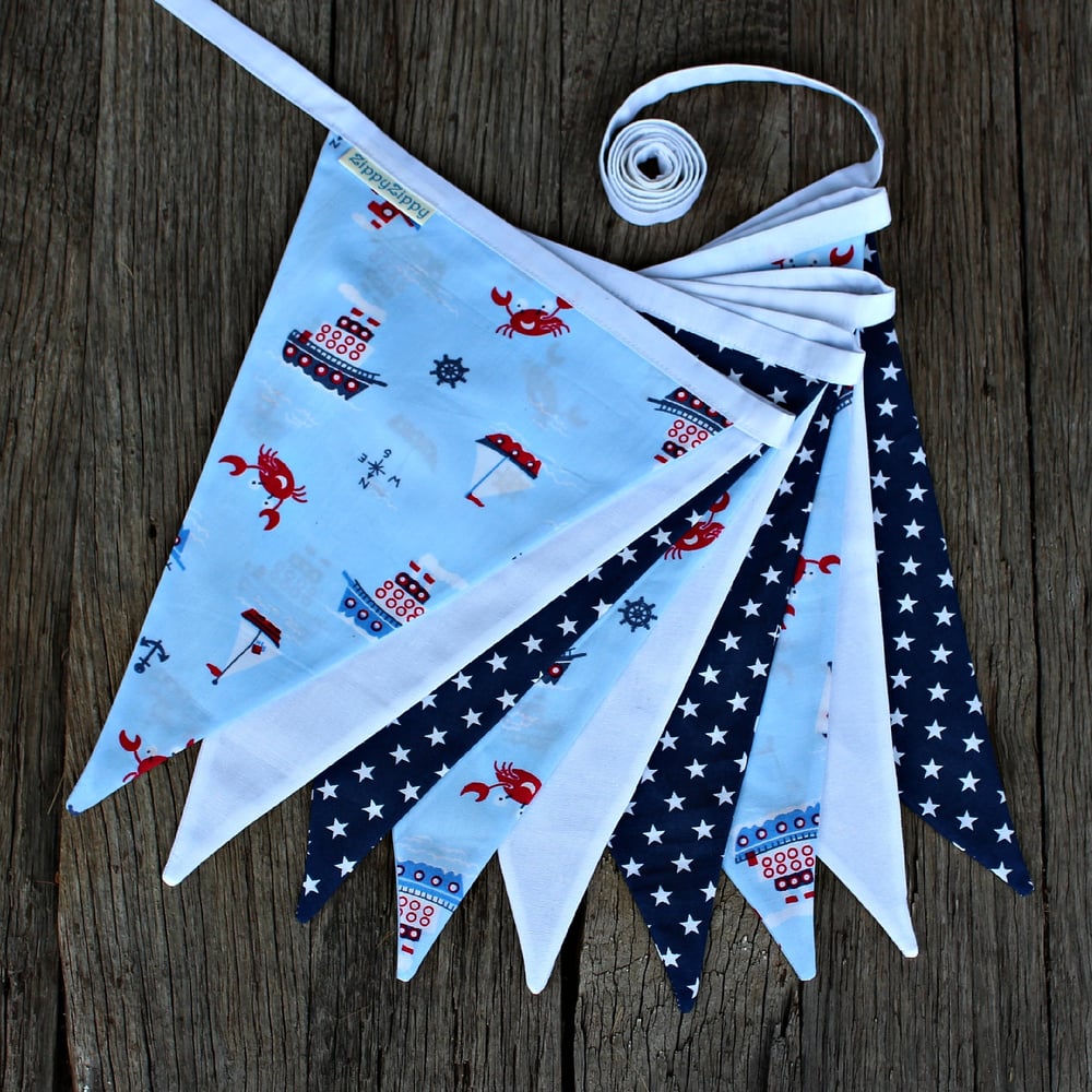 The Little Boats Bunting features a nautical themed pale blue fabric, co-ordinated with a white cotton and navy star print.